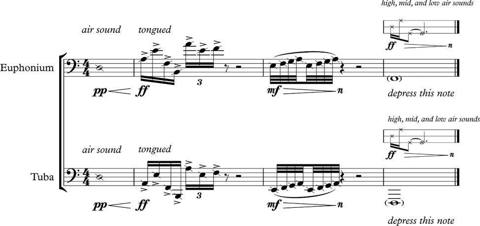 A few guidelines are necessary to utilize this technique to its best effect. First of all, slow breathing in the instrument can be soft dynamically to the point of being nearly inaudible. If the instrument is externally amplified, this is no big issue, but when played acoustically this can be a factor. Additionally, the use of loud, repeated breathing sounds (as in the creation of a ‘bellows effect’) can be physically taxing to the performer. There is little resistance when blowing air into the tuba, and doing this at a high volume for an extended period of time can lead to hyperventilation in the extreme, and physical discomfort in milder cases. Finally, breathing in through the instrument can, in some cases, lead to physical discomfort in the performer. This happens primarily if an instrument has been improperly maintained, as the leadpipe may have started to accumulate some debris. Regular maintenance on behalf of the performer will mitigate this issue. Moreover, the use of non-biodegradable valve oils may lead to a situation where a performer is inhaling harmful particles from the valve block. Again, this is non-issue provided that the performer observes proper maintenance and uses suitable valve oils (something that should be done regardless of intent to perform contemporary music).