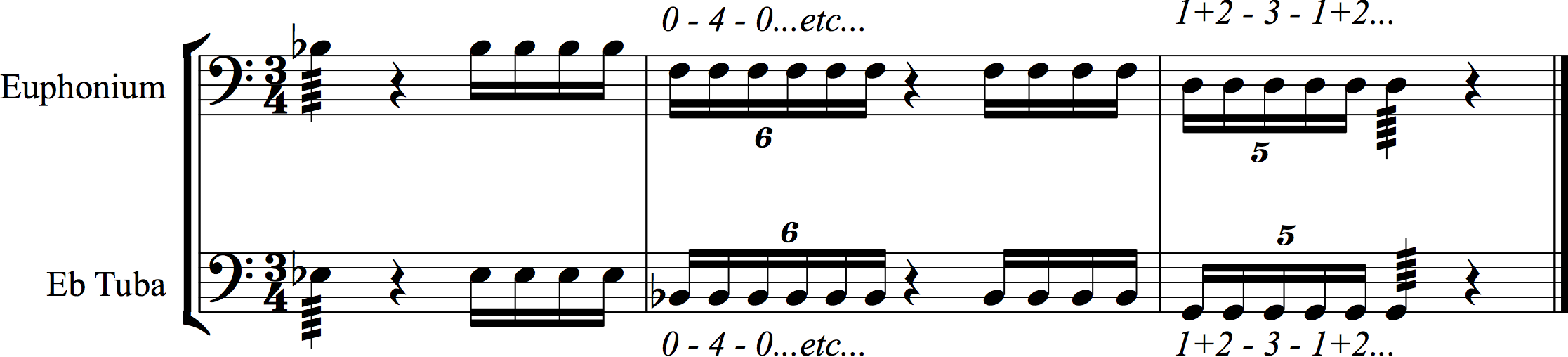 It is essential that the composer either a) allow for multiple alternatives, given the prevalence of different keys of tuba, or b) write for a specific key of instrument and use the exact fingerings for the given tremolo combination. Either option is preferable, given the aims of the composer. This is not an issue with the euphonium, which uniformly is notated either in C bass clef or Bb treble clef. To determine possible alternative fingerings, please consult the overtone charts from Section 2, under “Range/Harmonic Series”. For instance, on an F tuba, a middle C may be performed on the open bugle/6th partial, on valves 1+2 in the 7th partial, and on both valve 4 and valves 1+3 in the 8th partial. Each fingering produces their own microtonal variant on the note of middle C, and alternating between them can create a variety of tonal shadings.