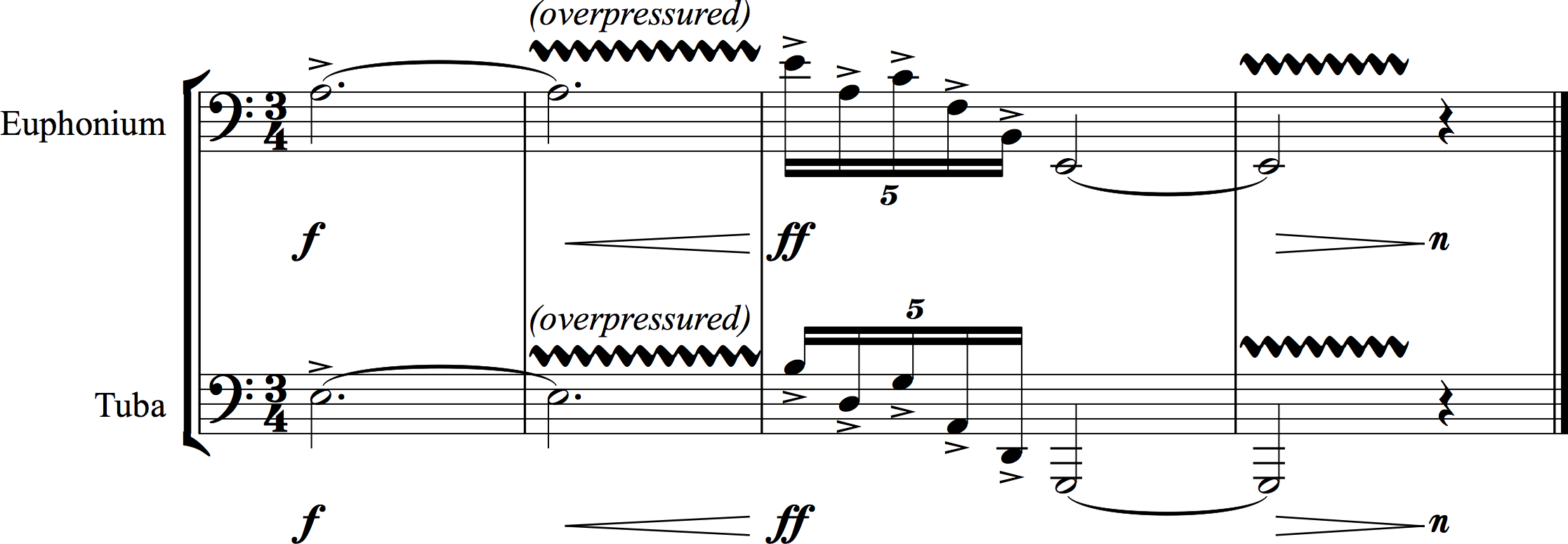This technique is seldom used, and as such, does not have a standard notation. Since the technique is often used on a spectrum (from ordinario embouchure to overpressured), it is helpful to notate this technique in a way that can be changed over time. One possibility involves the use of a rectangle above the main staff, which can be filled with a solid color in order to show full overpressurization, and then left hollow for ordinario embouchure. In the provided musical example, the overpressurization is activated at a constant rate, and as such is notated using a wavy line and text direction above the affected note.