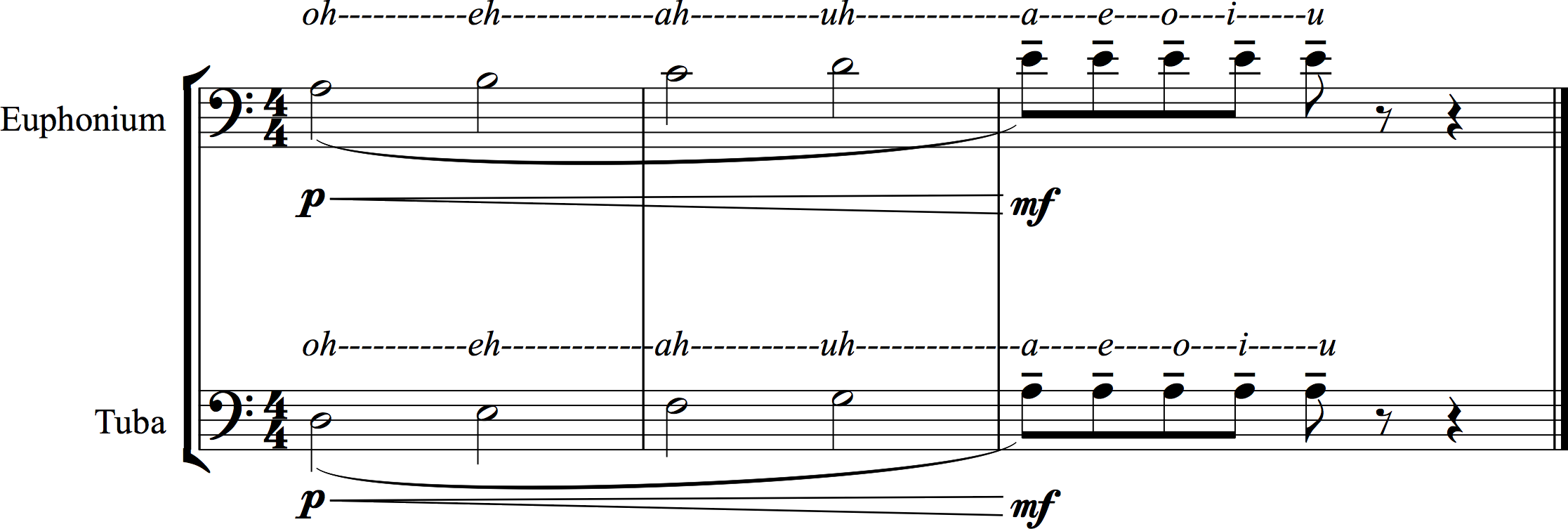 Given this technique’s use as an overlay effect on top of other modes of performance, it is wise to pick a notation that can be combined with standard staff-based notation. For vowel modification, this can simply come in the form of a listing of the desired vowel shapes above the staff. For general vowel shape, some sort of overlay notation is acceptable, assuming it is clear in its intent. As with vowel modification in vocal music, it can be helpful to utilize the International Phonetic Alphabet for notating the intended symbol. It must be noted, though, that tubists/euphonists do not receive training in the use of IPA, and any use of this notation must be explained clearly and thoroughly within the notes for the work.